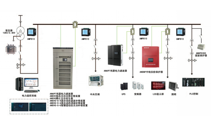 電能質量分析與治理系統由低壓側電能治理產品組成,主要產品有ANAPF有源電力濾波器、ANSVG靜止無功發生器、ANSNP中線安防保護器、ANHPD諧波保護器、ANSVC低壓無功功率補償裝置、ANSVG-G-A混合動態濾波補償裝置、ANSVG-S-A混合動態消諧補償裝置、ANSVG-S-G智慧型動態無功補償裝置等。